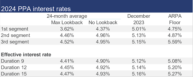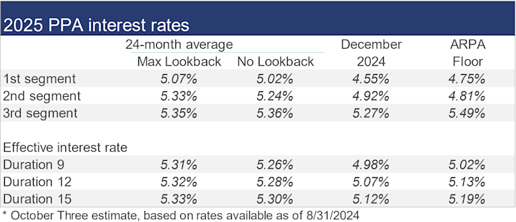 The table below summarizes rates that calendar-year plan sponsors are required to use for IRS funding purposes for 2024, along with estimates for 2025. Pre-relief, both 24-month averages and December ‘spot’ rates, are also included.