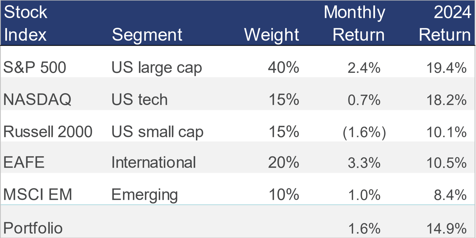 Stocks were mixed during August. A diversified stock portfolio gained more than 1% last month and is now up 15% for the year through August, with US large cap and tech stocks leading the way: