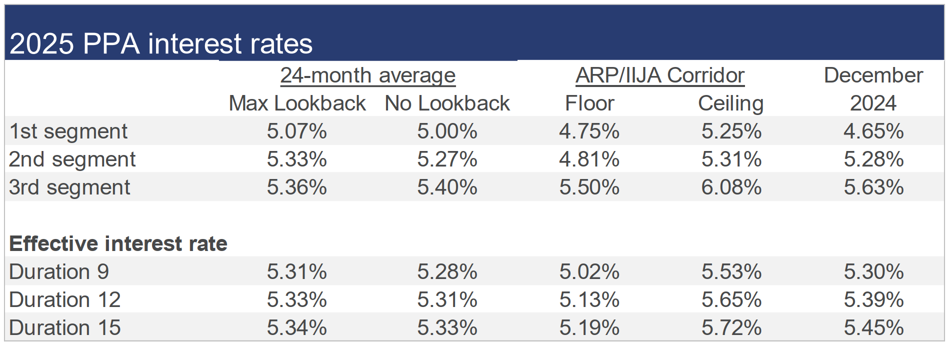 The table below summarizes rates that calendar-year plan sponsors are required to use for IRS funding purposes for 2025, along with estimates for 2026, including the rate “corridor” that applies to the 24-month average rates under funding relief for each segment.