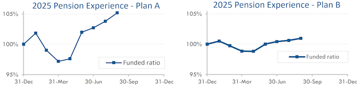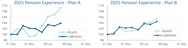 Pension tailwinds have continued in 2025, due to strong stock markets and stable interest rates. The graphs below show the movement of assets and liabilities for our two model plans so far this year: