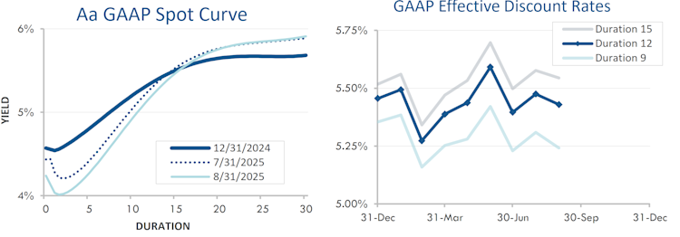 Pension liabilities (for funding, accounting, and de-risking purposes) are driven by market interest rates. The first graph below compares our Aa GAAP spot yield curve at December 31, 2024 and August 31, 2025 (along with the movement in the curve last month). The second graph below shows our estimate of movements in effective GAAP discount rates for pension obligations of various duration during 2025: