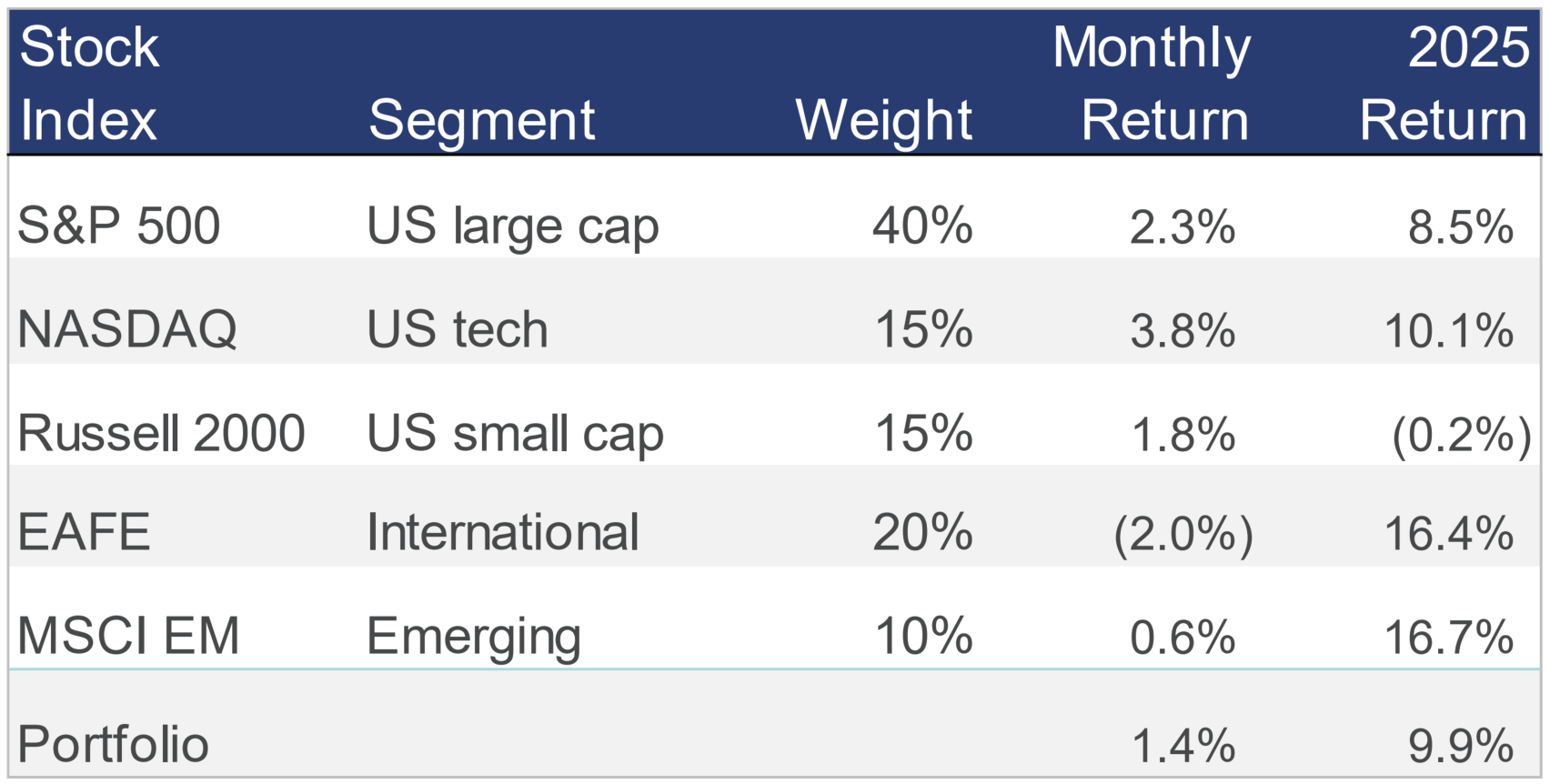 Overall, our traditional 60/40 portfolio gained less than 1% last month and is now up 7% so far this year, while the conservative 20/80 portfolio was flat last month and remains up 4% through the first seven months of 2025.