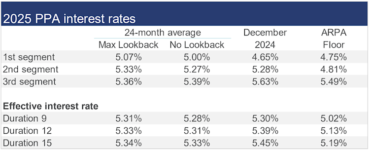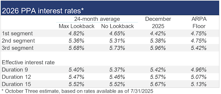 The table below summarizes rates that calendar-year plan sponsors are required to use for IRS funding purposes for 2025, along with estimates for 2026, including the rate “floor” that applies to the 24-month average rates under funding relief for each segment.