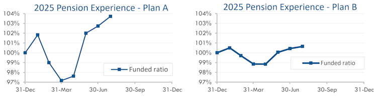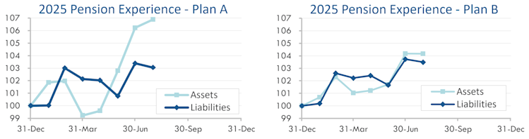 Since the end of March, stocks have produced double-digit returns; at this point, 2025 is shaping up to be yet another year of good news for pension finances. The graphs below show the movement of assets and liabilities for our two model plans so far this year: