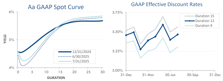 Pension liabilities (for funding, accounting, and de-risking purposes) are driven by market interest rates. The first graph below compares our Aa GAAP spot yield curve at December 31, 2024 and July 31, 2025 (along with the movement in the curve last month). The second graph below shows our estimate of movements in effective GAAP discount rates for pension obligations of various duration during 2025: