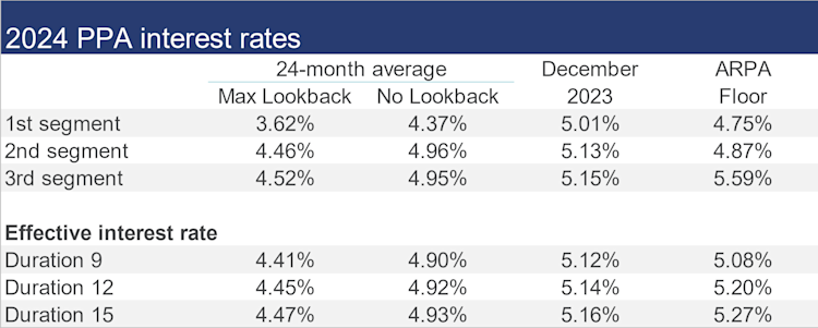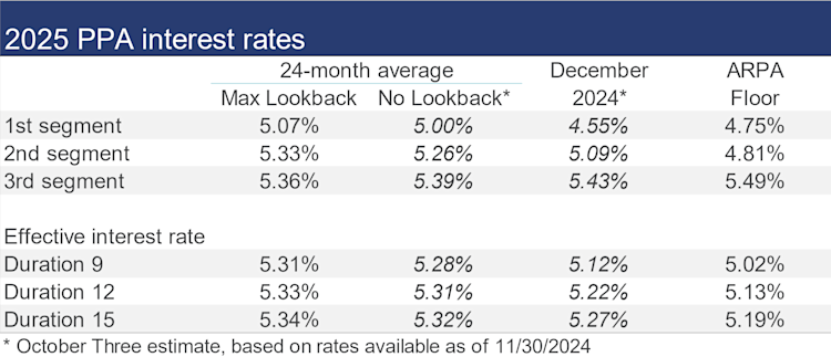 The table below summarizes rates that calendar-year plan sponsors are required to use for IRS funding purposes for 2024, along with estimates for 2025. Pre-relief, both 24-month averages and December ‘spot’ rates, are also included.