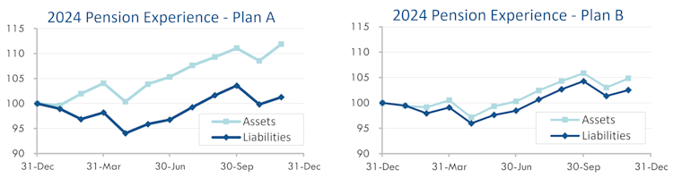 Strong US stock market returns propelled pension finances to a new 2024 high-water mark in November. Both model plans we track[1] gained ground last month: Plan A improved more than 1% last month and is now up 10% this year through November, while Plan B gained a fraction of 1% and is now up 2% through the first eleven months of 2024: