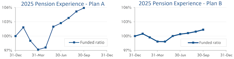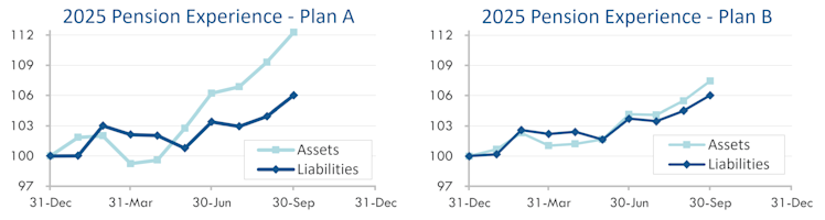 Pension finances have enjoyed continued tailwinds in 2025, as double-digit stock returns have outpaced modest declines in interest rates. The graphs below show the movement of assets and liabilities for our two model plans through the first three quarters of the year: