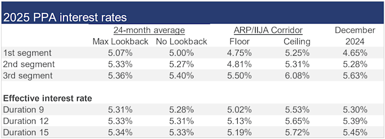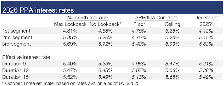 The table below summarizes rates that calendar-year plan sponsors are required to use for IRS funding purposes for 2025, along with estimates for 2026, including the rate “corridor” that applies to the 24-month average rates under funding relief for each segment.