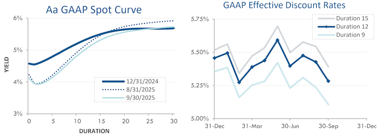 Pension liabilities (for funding, accounting, and de-risking purposes) are driven by market interest rates. The first graph below compares our Aa GAAP spot yield curve at December 31, 2024 and September 30, 2025 (along with the movement in the curve last month). The second graph below shows our estimate of movements in effective GAAP discount rates for pension obligations of various duration during 2025: