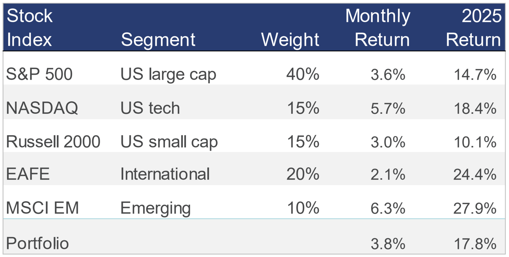Overall, our traditional 60/40 portfolio gained 3% last month and is now up 12% so far this year, while the conservative 20/80 portfolio gained 2% last month and is now up more than 7% through the first three quarters of 2025.